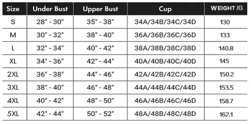 Answer: Step 1,Measure your band size Place the measuring tape around your ribcage, right underneath the band of your bra.Make sure it is pulled tight but is not uncomfortable and that the tape is level.Make a note of how many inches you are.If you land on an even number this is your band size.If you land on an odd number, you’ll want to round up or round down to the nearest even number based on your build. Step 2,Measure your bust size Place the measuring tape around the fullest part of your bust(at nipple level),making sure to hold the measuring tape snugly against you and parallel to the ground. You won’t need to pull the tape particularly tight for this measurement it just needs to sit flat.Make a note of how many inches you are.If it falls on the half-inch, just round up. That’s your bust size! Step 3,Determine Your Cup Size Minus your band size from your cup size and make a note of this value.This difference indicates your cup.Example: 37 inches (bust) – 34 inches (band) = 3 inches. That's a 34C. 0=AA , 1=A, 2=B, 3=C, 4=D, 5=DD(E),6=DDD(F), 7=G
