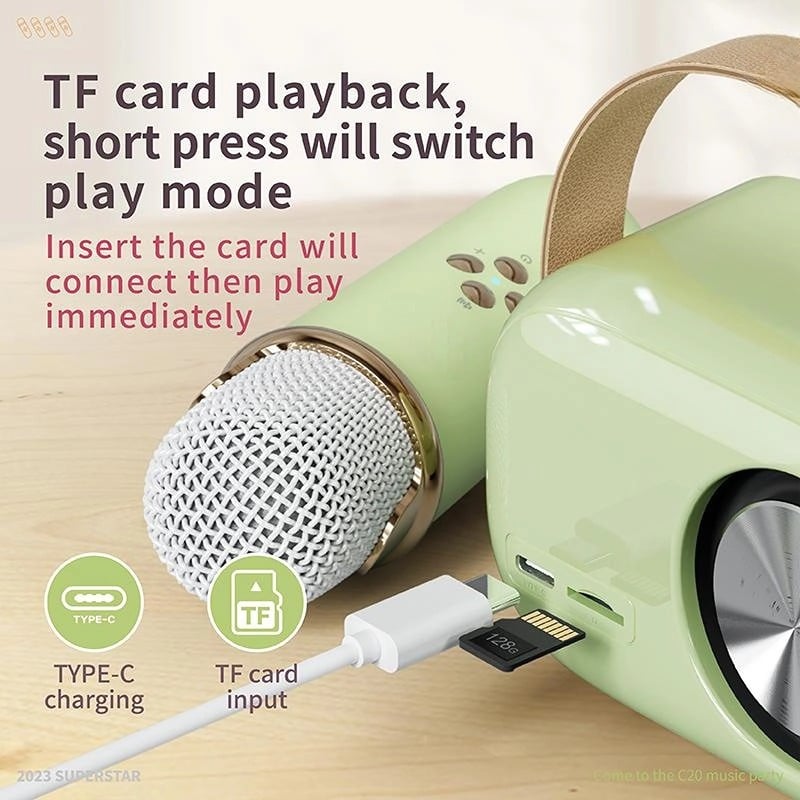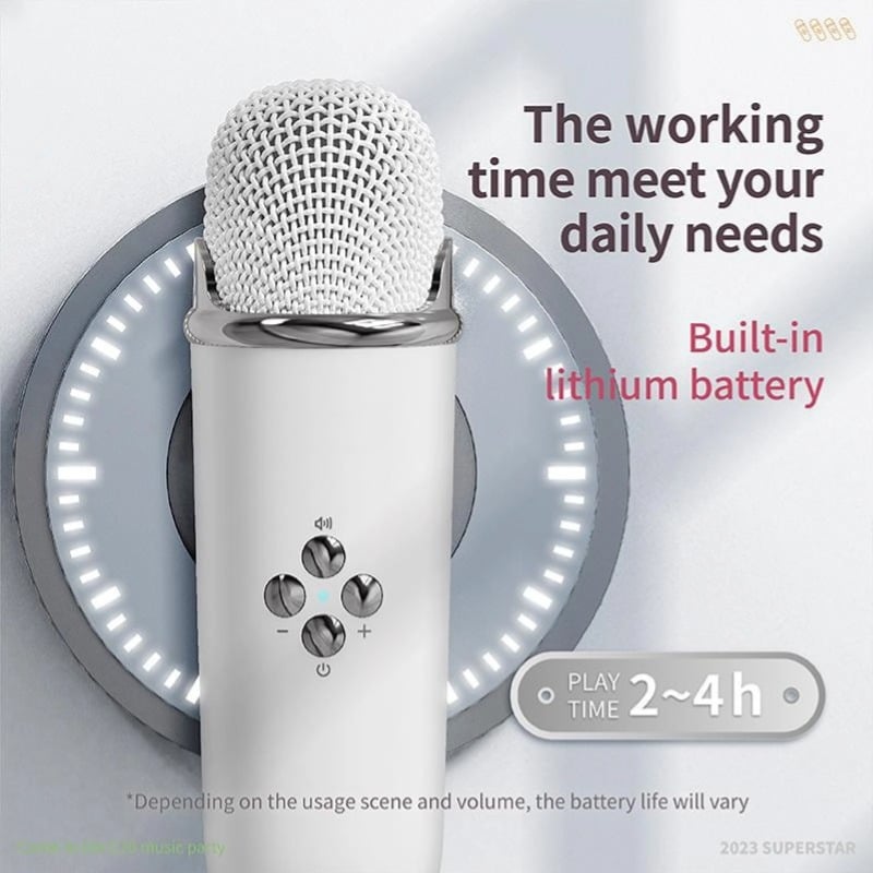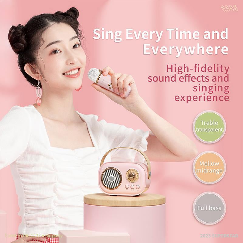 【Palm Size & Rechargeable】 Portability meets convenience with our cute karaoke machine. The speaker’s palm size (size: 4.1 x 2 x 2.8in, weight: 0.6lb) and elegant handle make it incredibly easy to carry wherever you go. Comes with a type-C charging cable, which can be used to charge both the speaker and microphone. With a single charge, enjoy up to 2-4 hours of playtime for both the speaker and microphone.